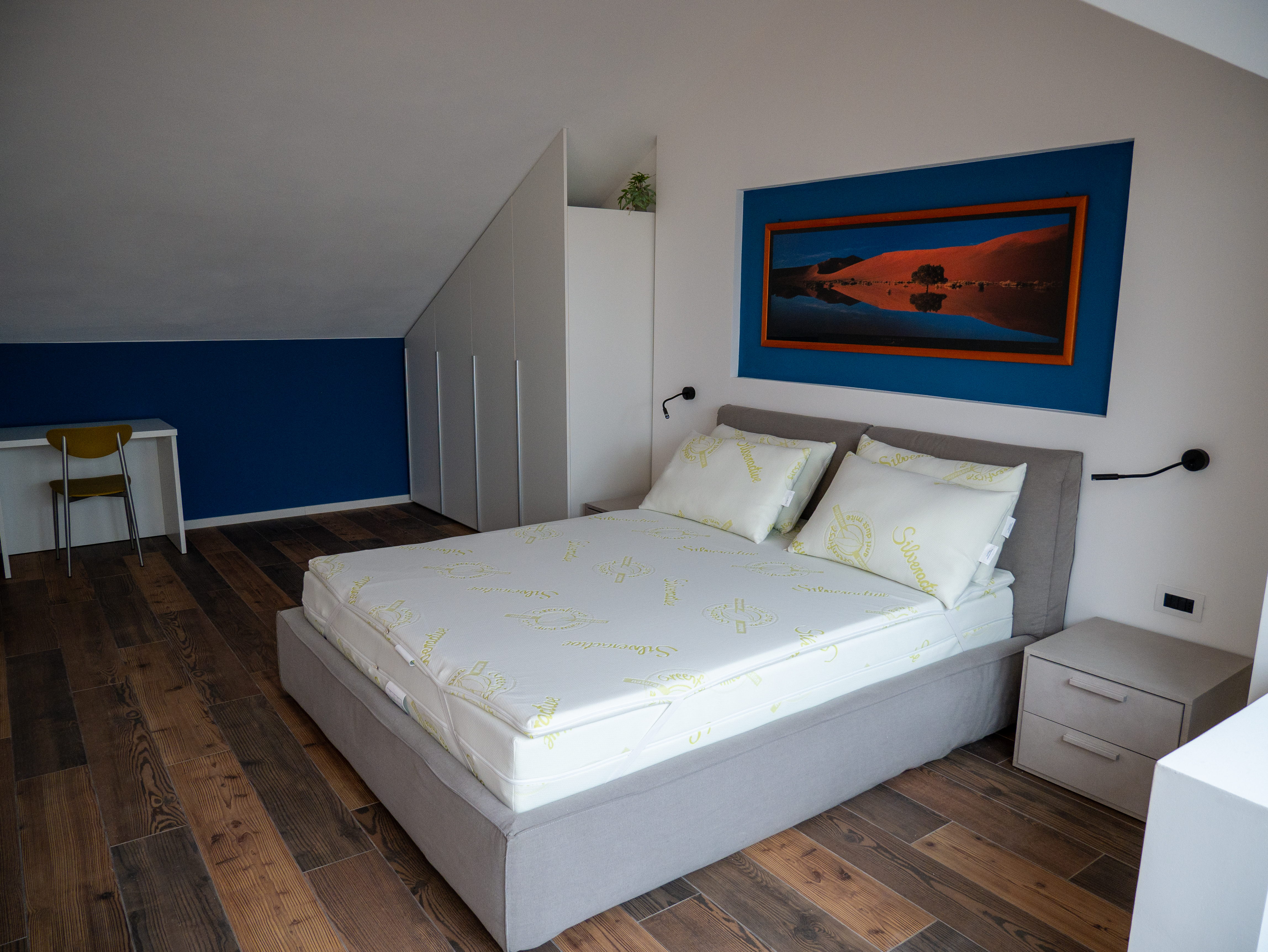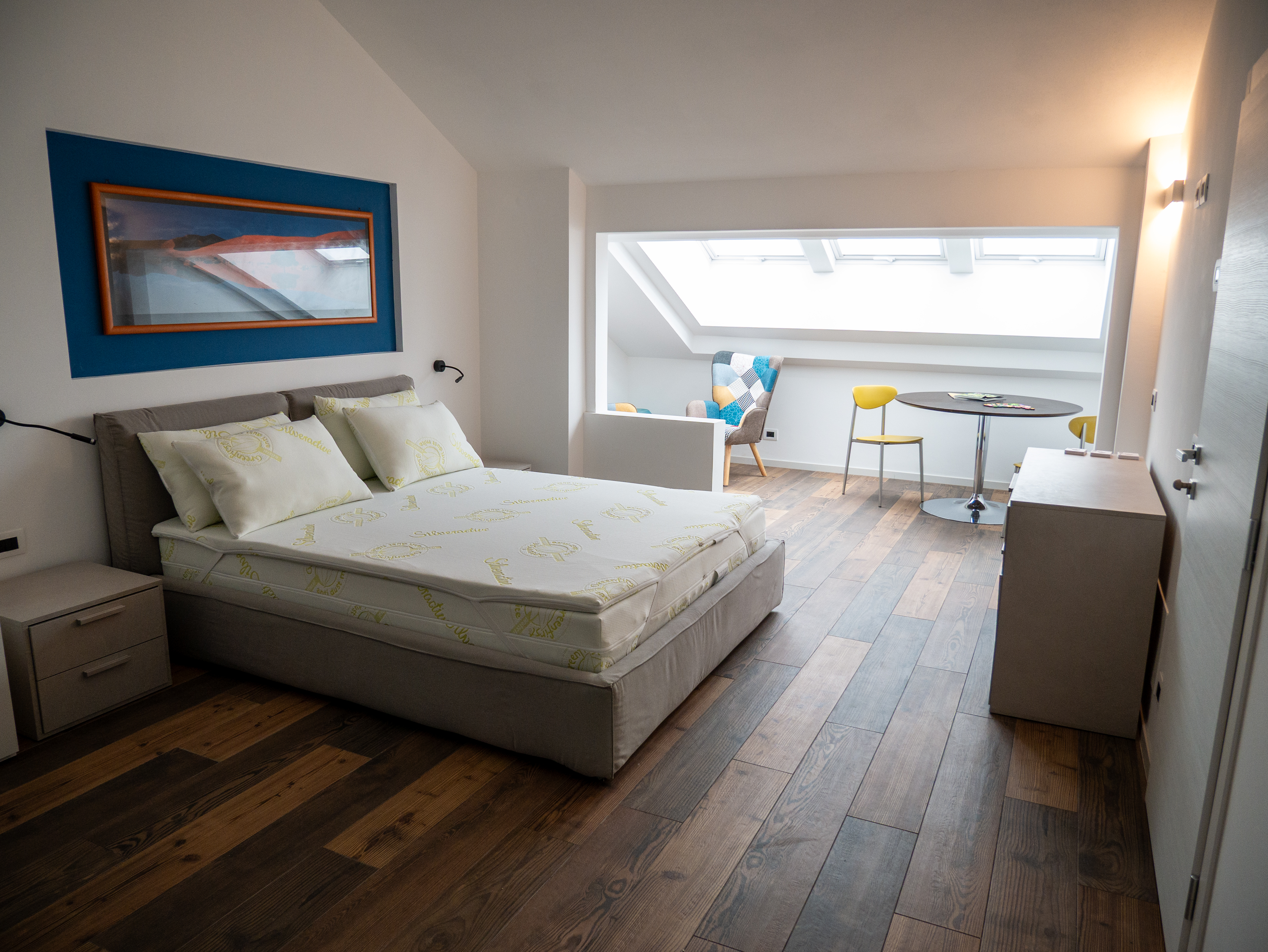 This bright and modern room offers a cozy retreat with a stunning mountain view. Featuring a comfortable double bed with hypoallergenic bamboo-fiber mattresses and a soft topper, it guarantees a healthy and restful sleep. The stylish wooden flooring and contemporary furnishings create a warm and elegant atmosphere. A large skylight floods the space with natural light, while guests can also enjoy a comfortable reading chair, a small dining table with seating, and practical amenities such as a nightstand and chest of drawers. Perfect for couples or solo travelers, this room is designed to make your stay both relaxing and inspiring.